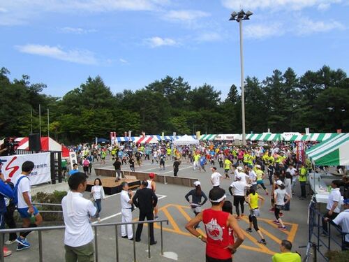 4年ぶりに火祭りロードレースに出場です。前回(2013年)は雨の中のレースでとっても難儀したんですが、今年は曇り時々晴れの天気で気温もさほど高くなく、この時期のレースとしては絶好のコンディションと言える状態です。 《レース前の準備体操》 私自身は…